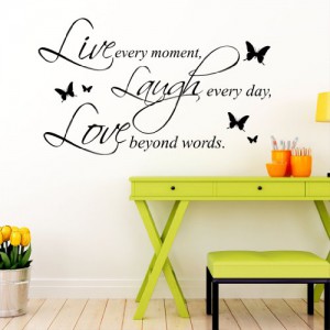 Wandtattoo: Live, Laugh, Love / Schriftzug: Live every moment, Laugh every day, Love beyond words. + 5 Schmetterlinge / 49 Farben / 4 Größen / schwarz / 35 x 59 cm