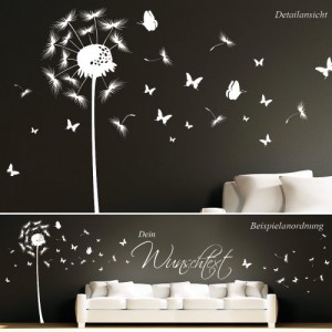 Wandtattoo: Pusteblume Schmetterling mit Wunschtext / 49 Farben / 3 Größen / weiß / 114 x 359 cm