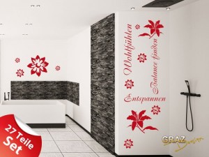 Wandtattoo Wandaufkleber Set für Badezimmer Wellness Schriftzüge Blumen 100x57cm Rot